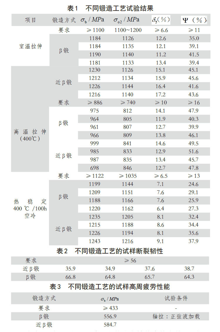 分別使用兩種不同的鍛造工藝,即近β鍛和β鍛,根據這兩種鍛造工藝進行性能檢測,分別檢測室溫拉伸,高溫拉伸和熱穩定狀態下兩種鍛造方式的性能差異,由于鍛造工藝受到金屬本身的性能影響,因此需要提前進行熱處理才能進行后續試驗,檢測結果如表1~3所示。